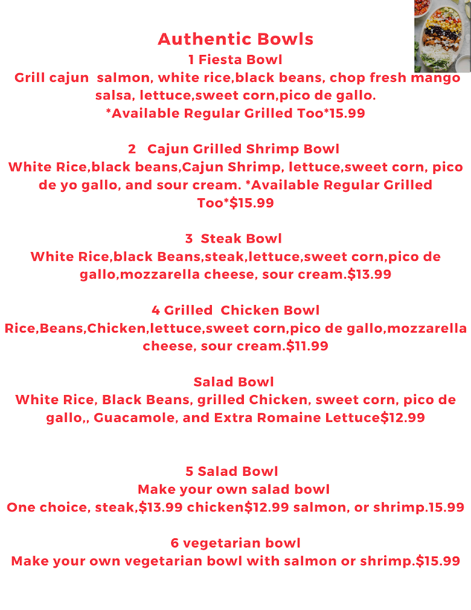 Burrito and bowls comes rice beans lettuce pico de gallo sour cream sweet corn Mexican Blend Shredded Cheese. Tacos pico de gallo onion cilantro,